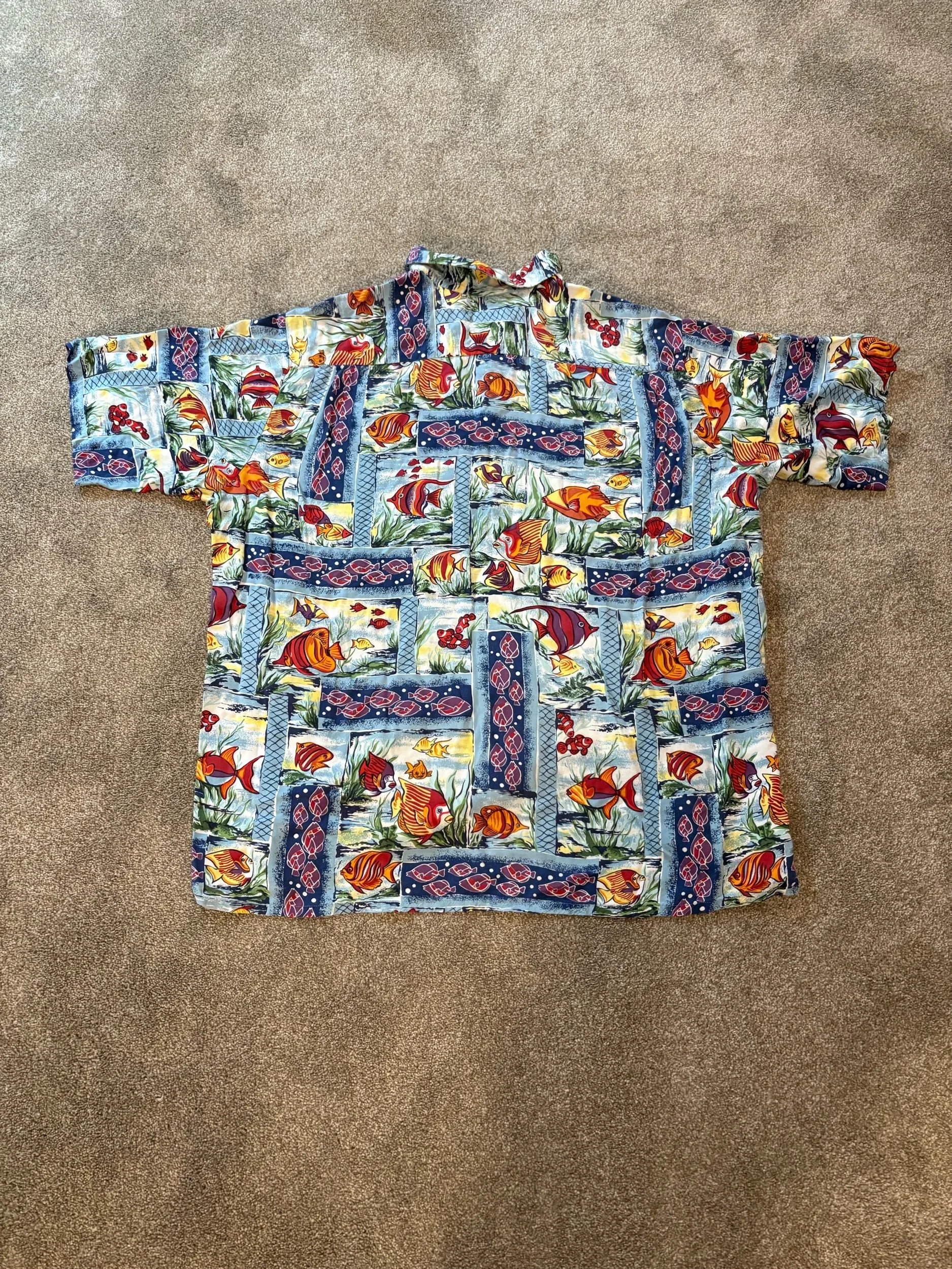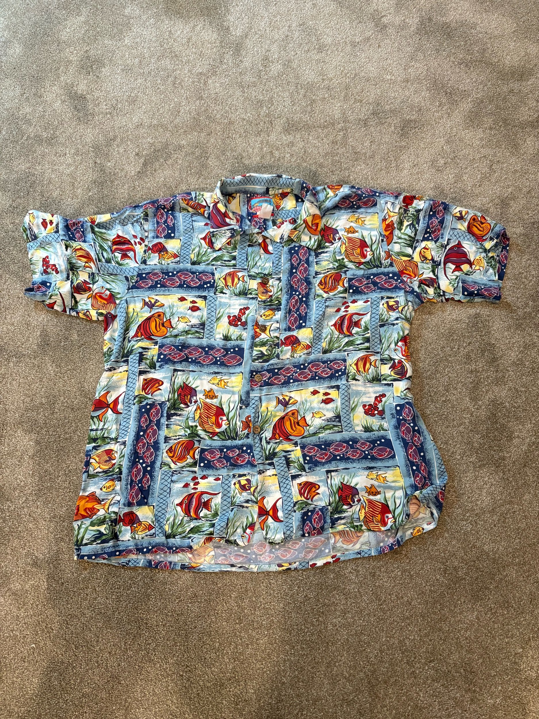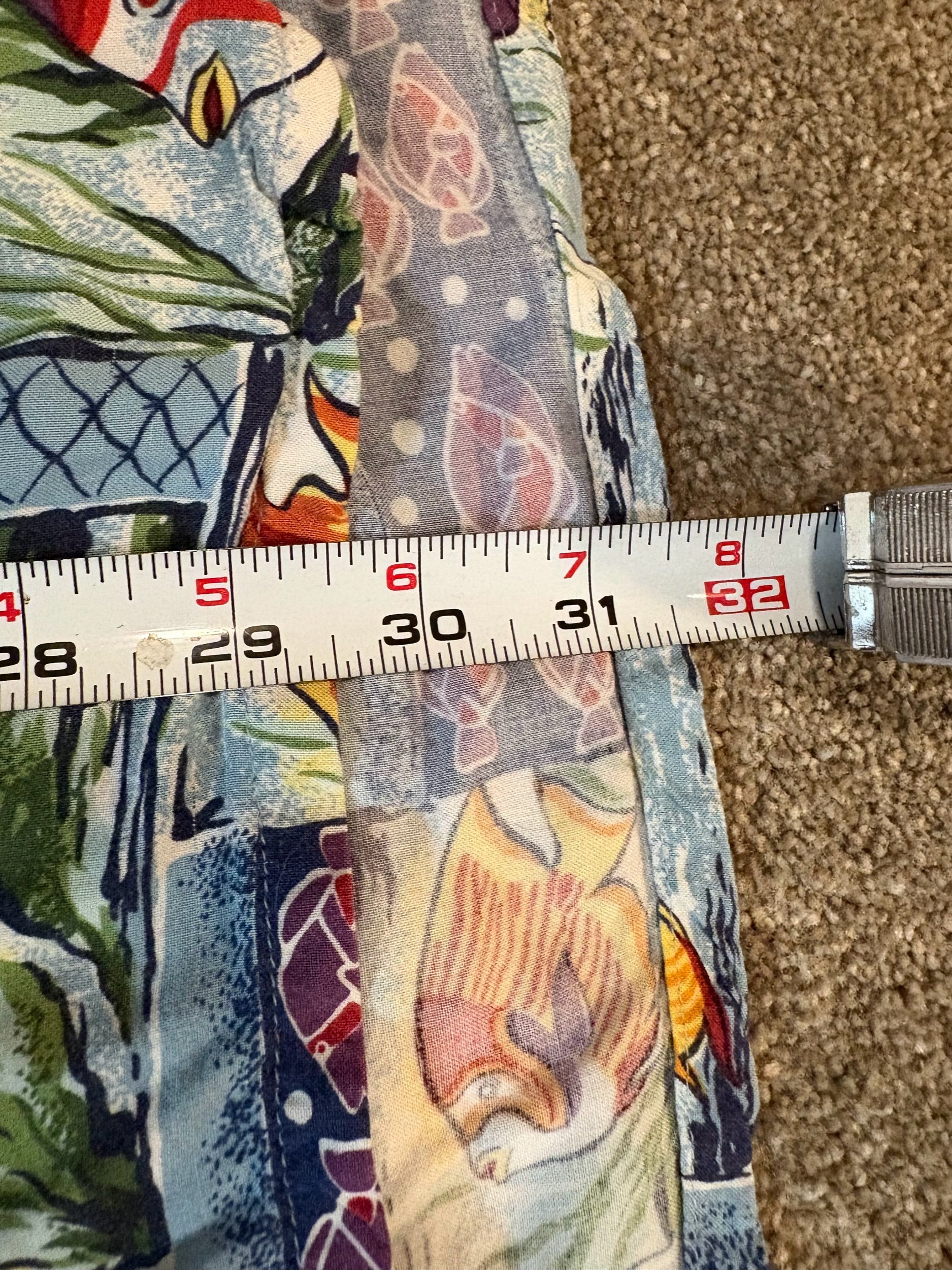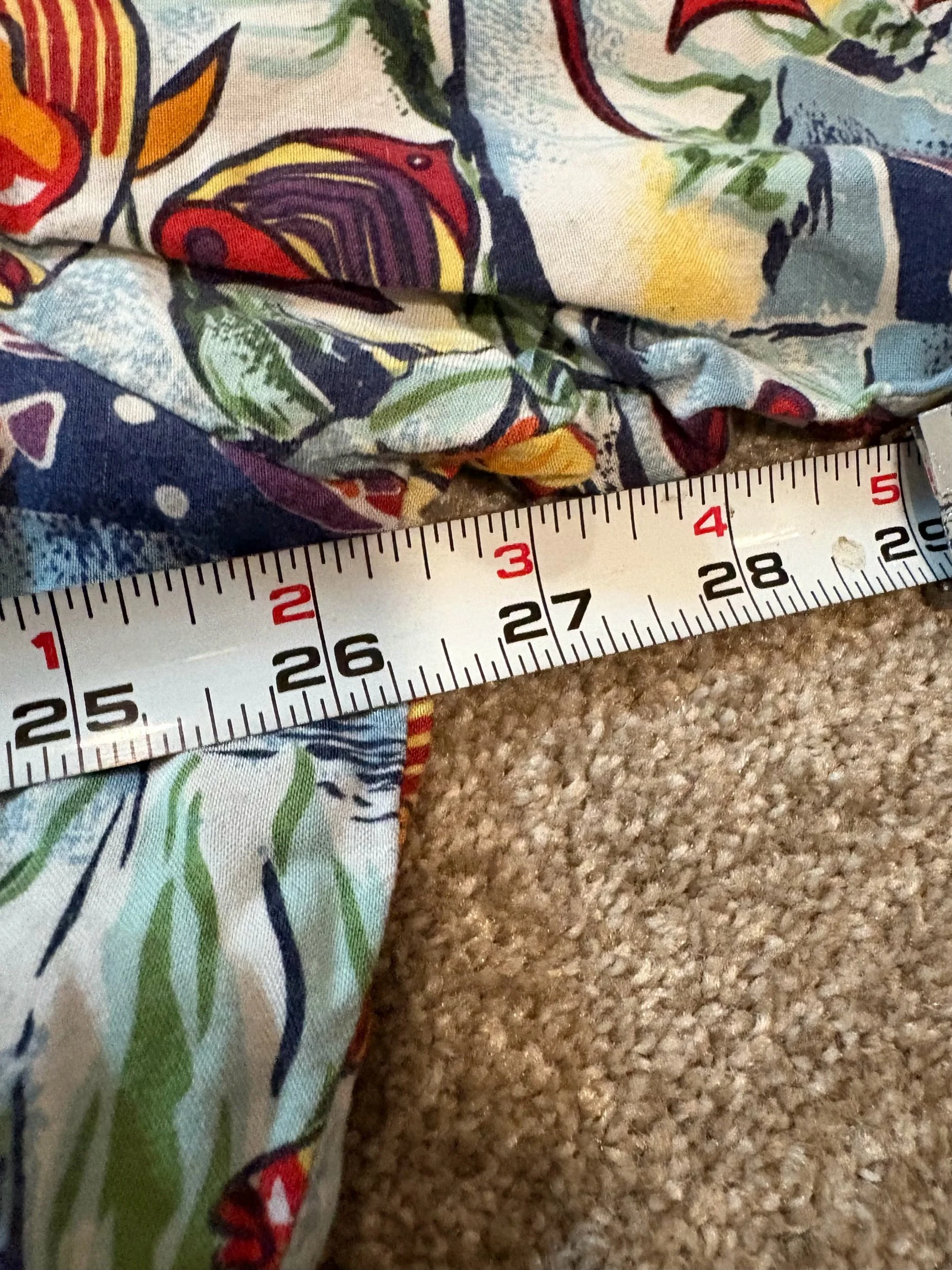 Size 2XL? Doesn’t say on tags, but don’t you worry one bit! I took measurements: Pit to Pit 26.5”, Length 29.5” in the front, 31.5” in the back. That reads confusingly, see pictures for clarity