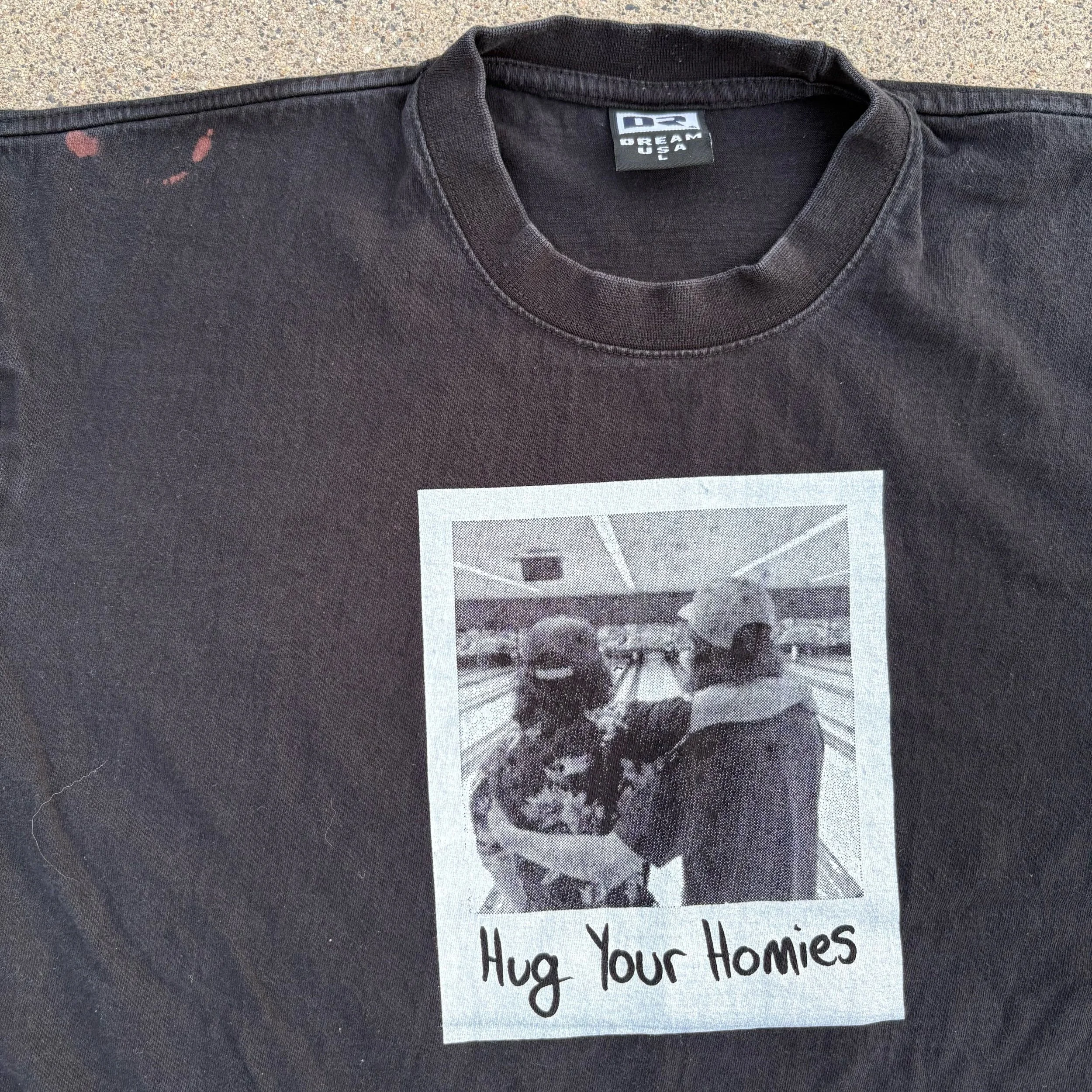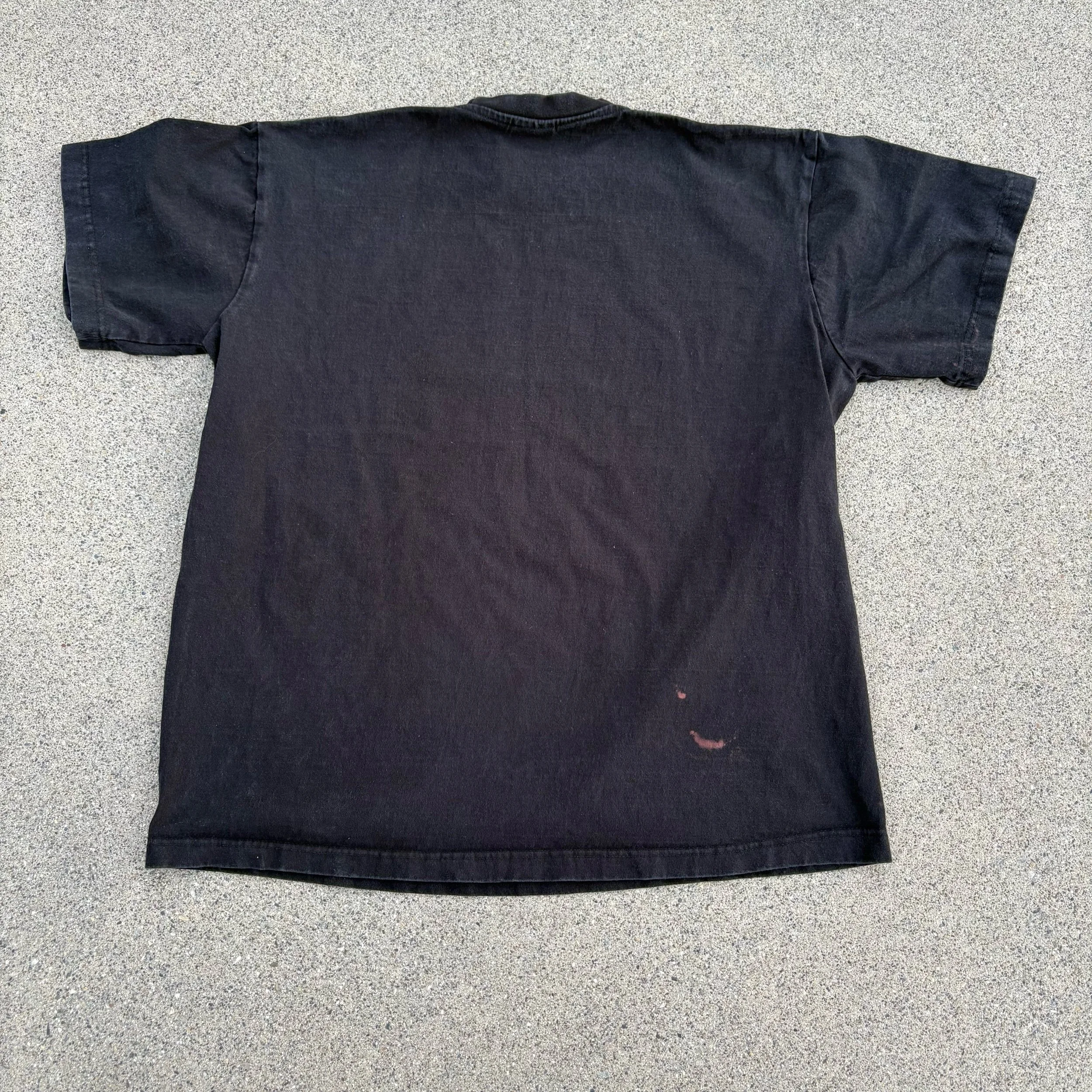 Dream USA Heavyweight Black T-Shirt Size Large, Pit to Pit 23.5”, Length 28.5”, 100% Cotton. This is one of my top 5 favorite blank tees, always pick this up when I find one, has a couple minor bleach stains as pictured.