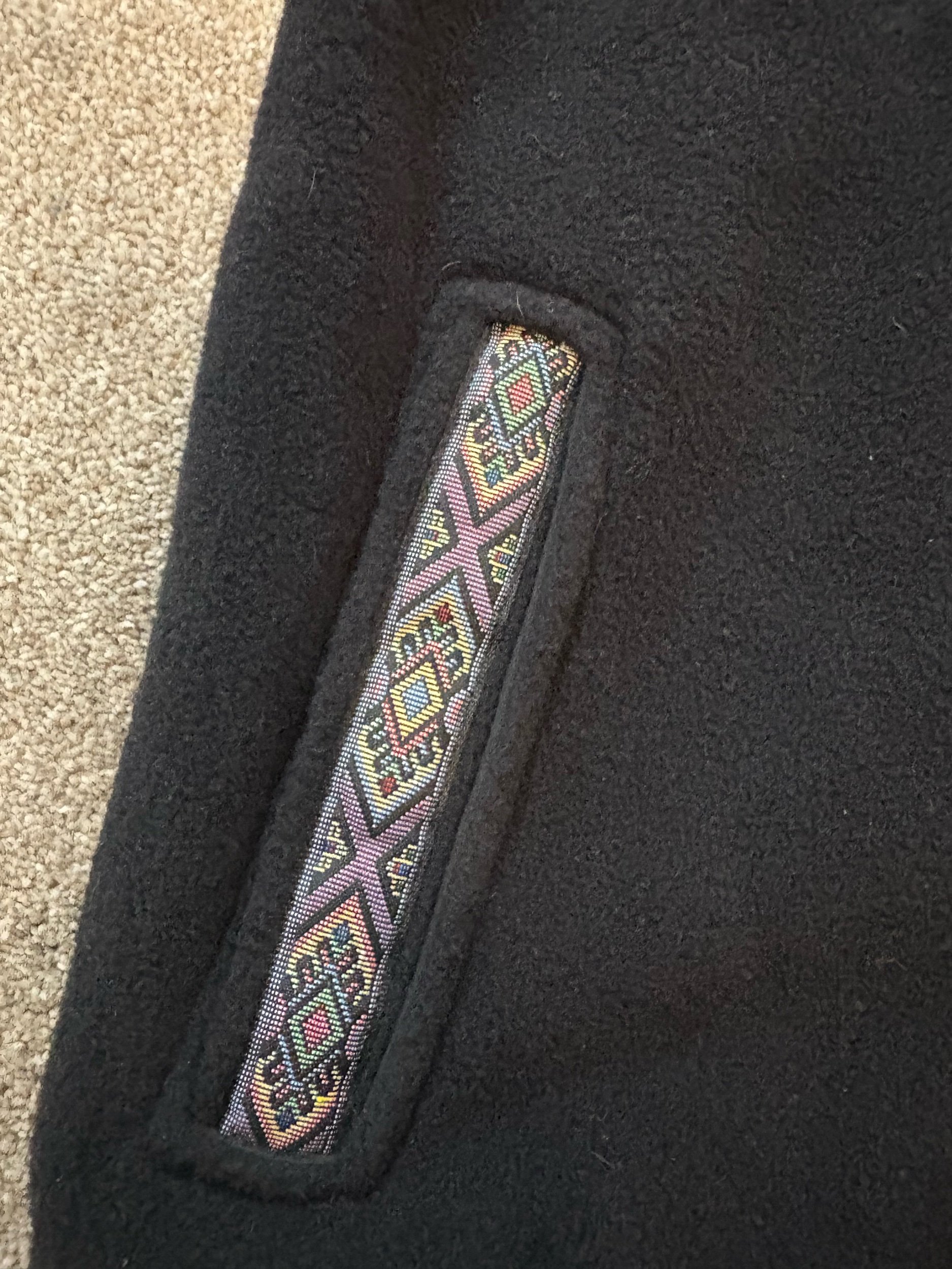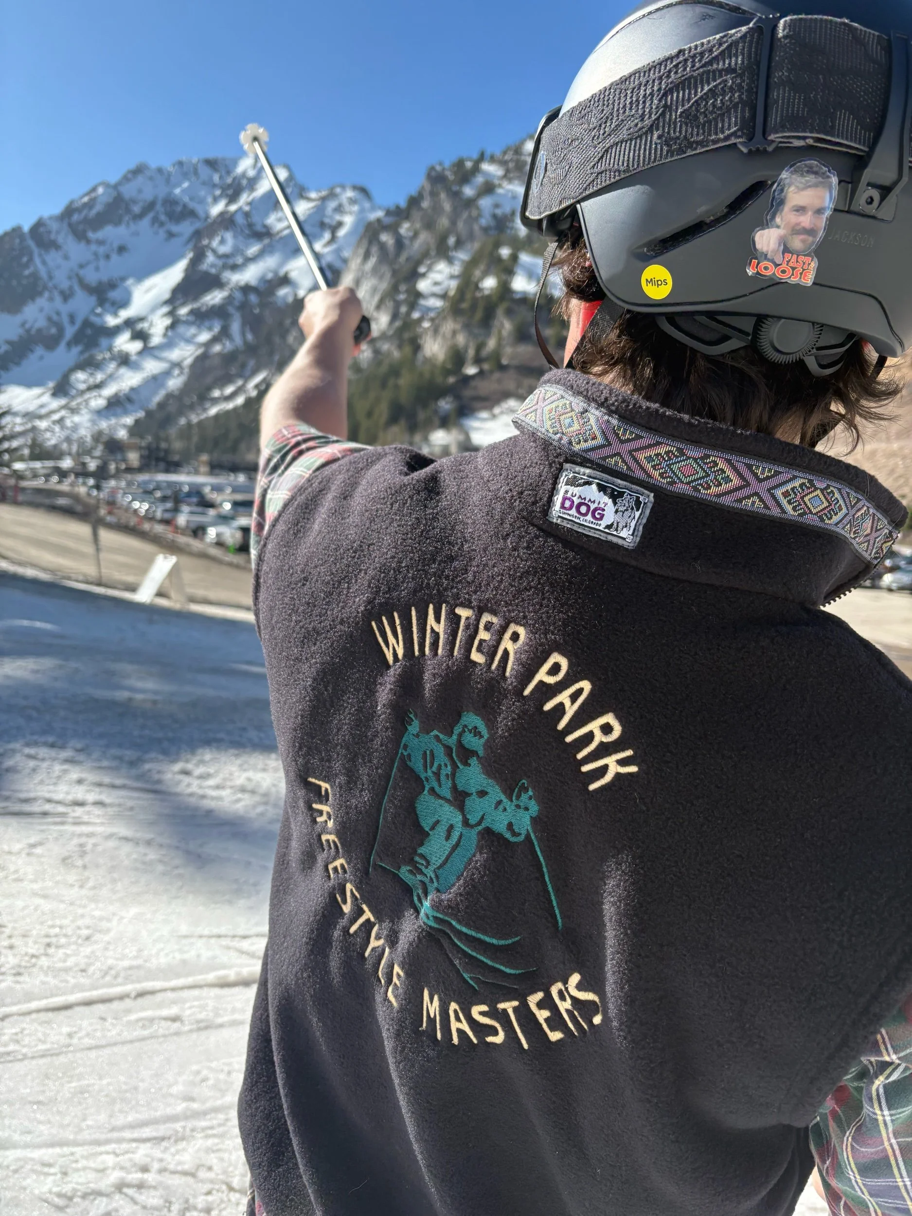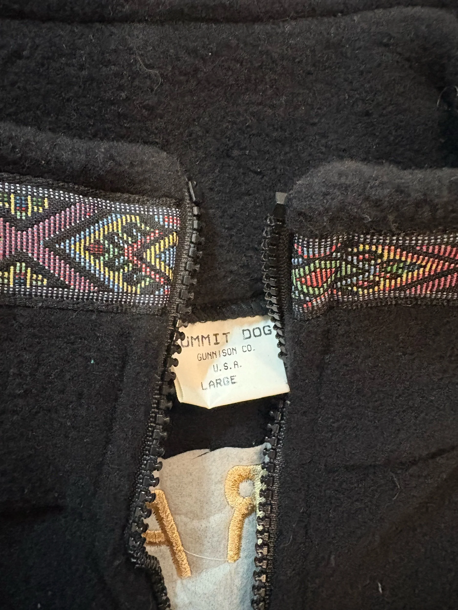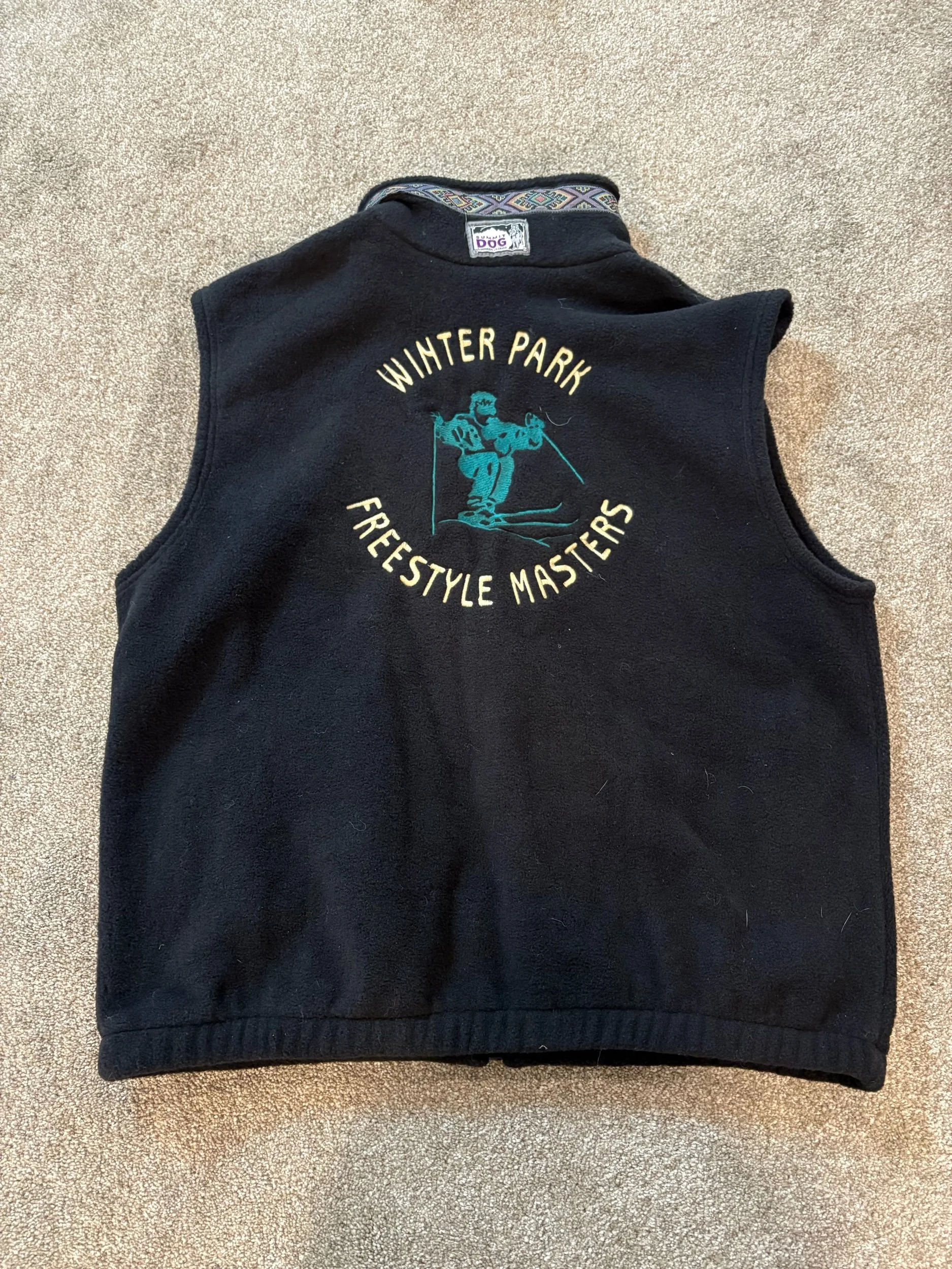 Vintage 90s Aztec Black Fleece Ski Vest, made by Summit Dog in Gunnison, CO with Winter Park Freestyle Masters Embroidery on the back