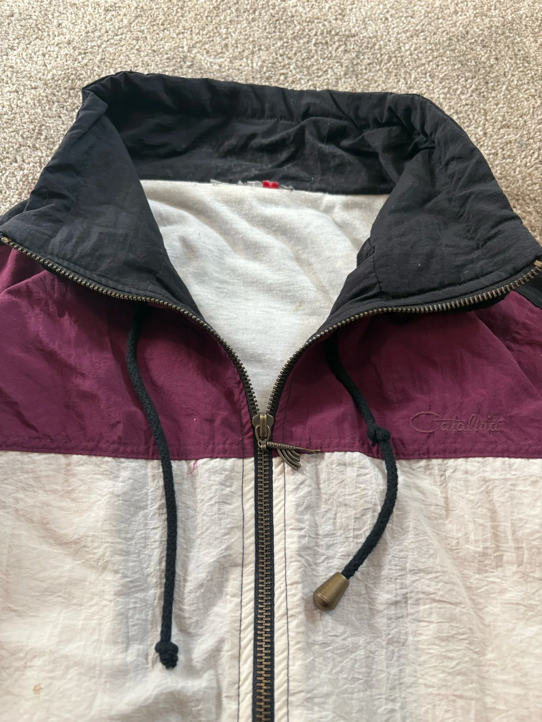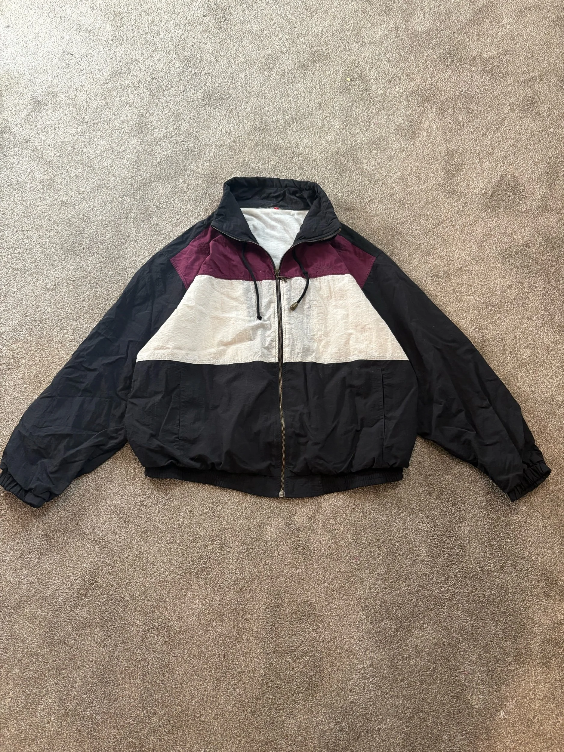 Black, White, and Maroon Vintage windbreaker with intricate zipper detail.