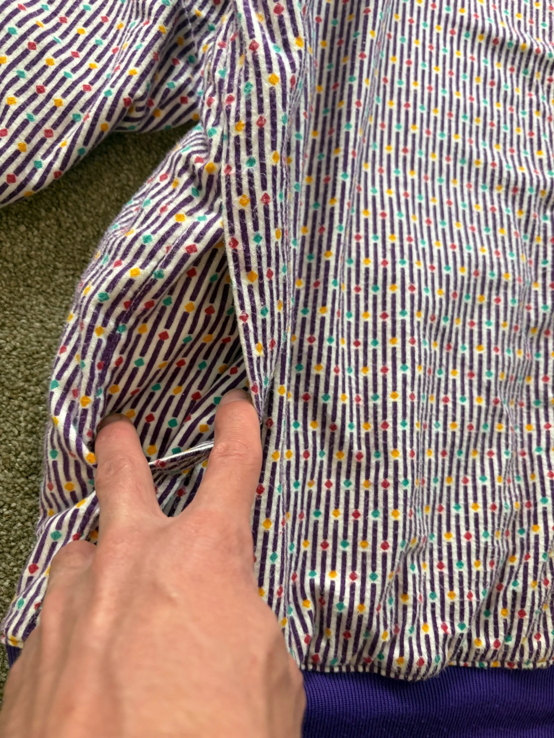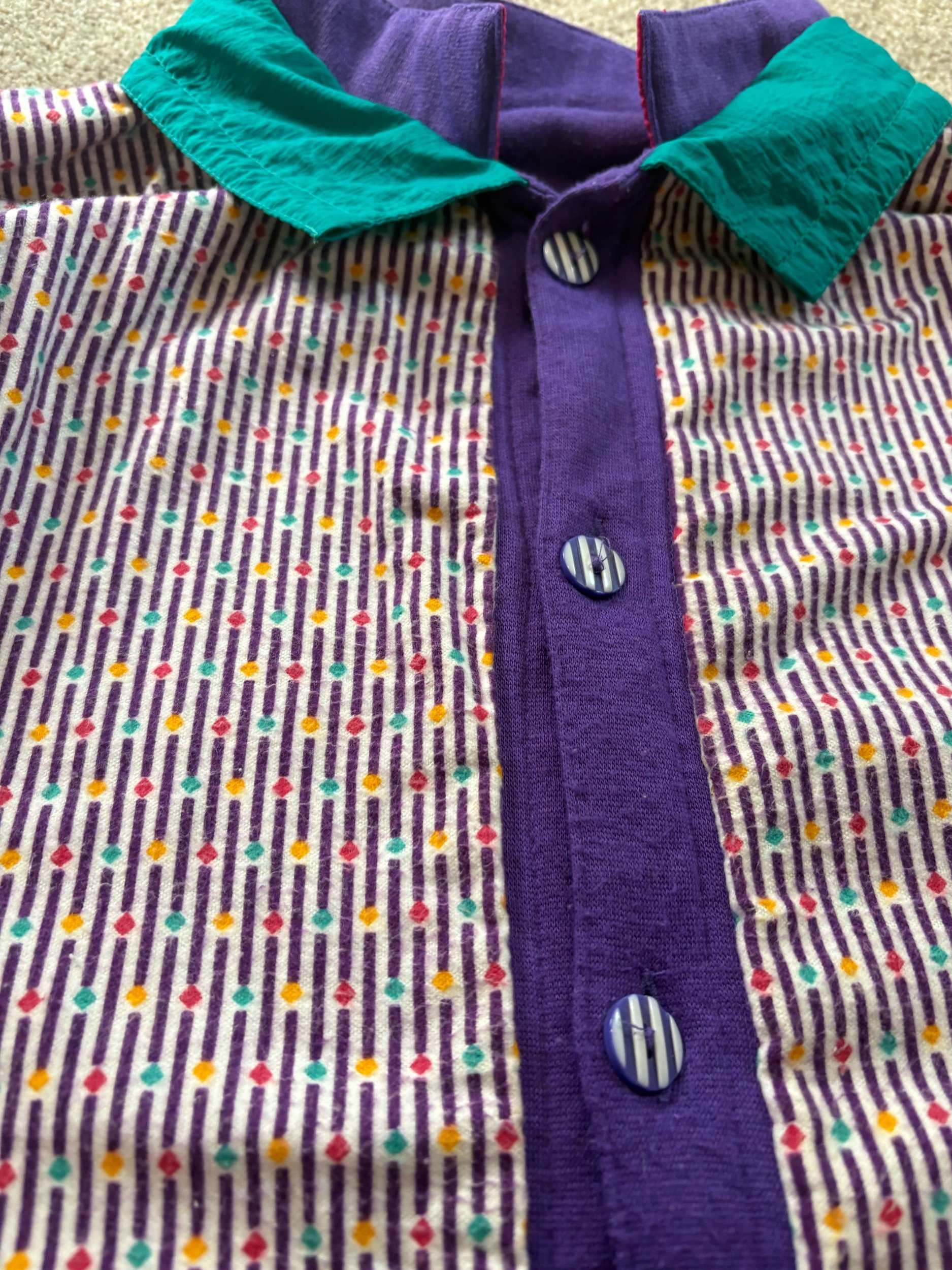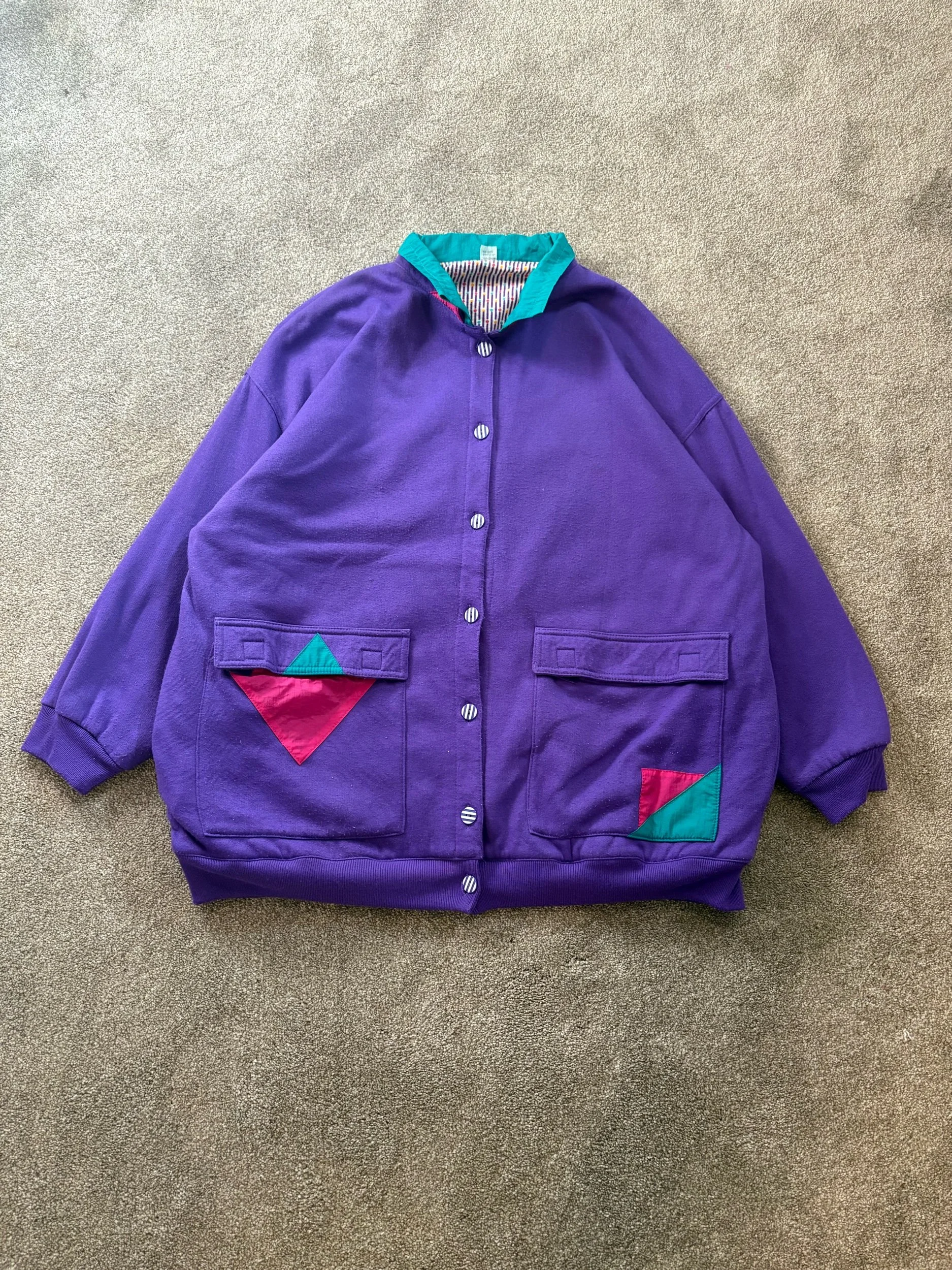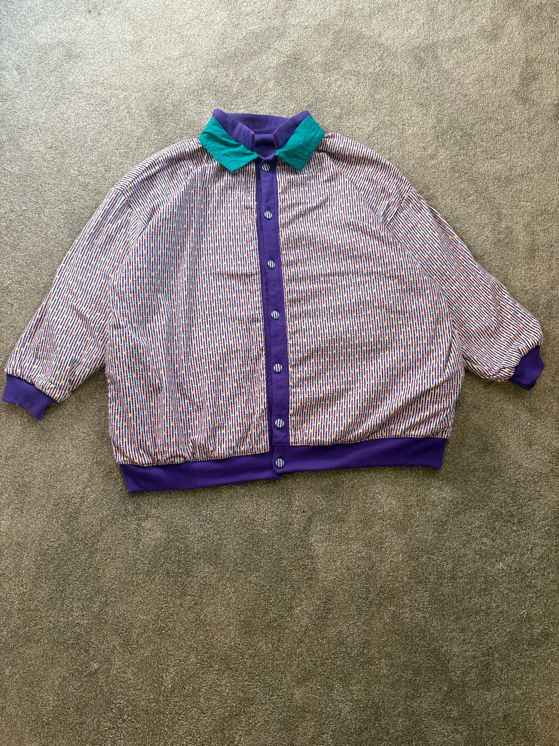 Purple on one side, White/Purple/Green pattern on the other side. Both sides with pockets. Super fun and unique