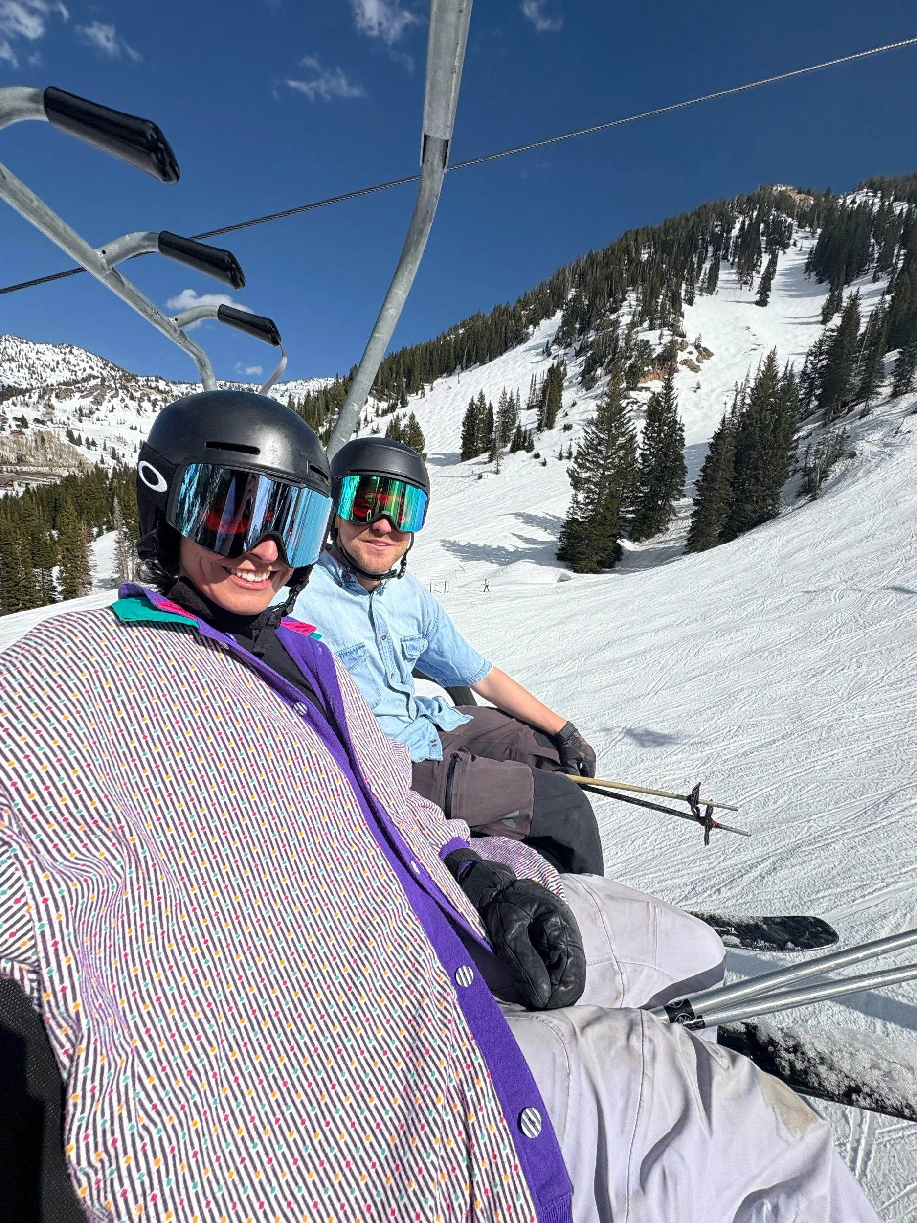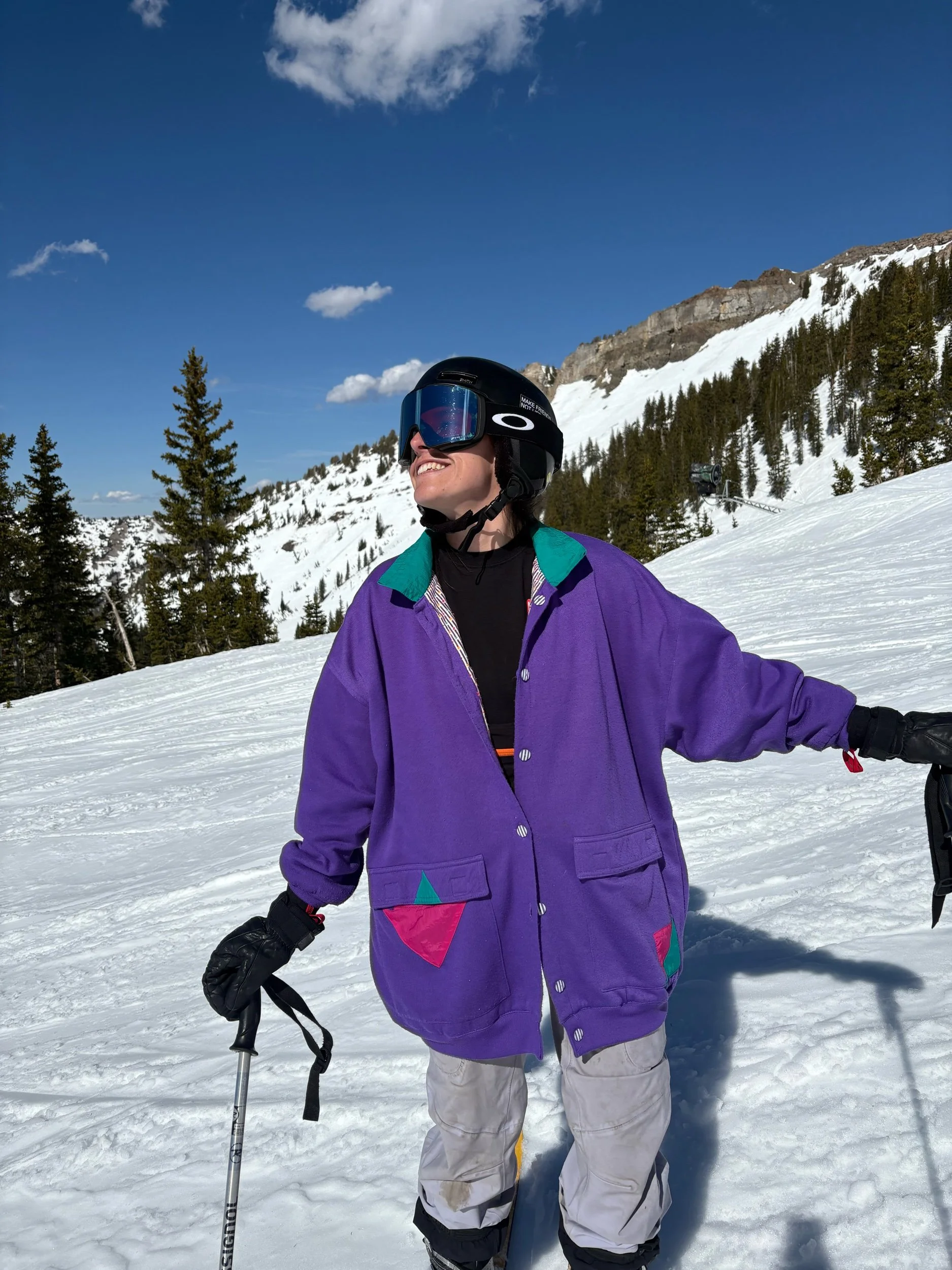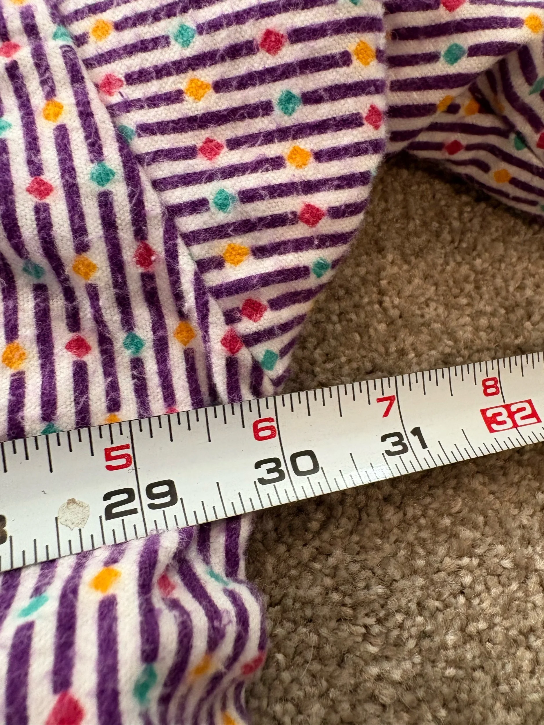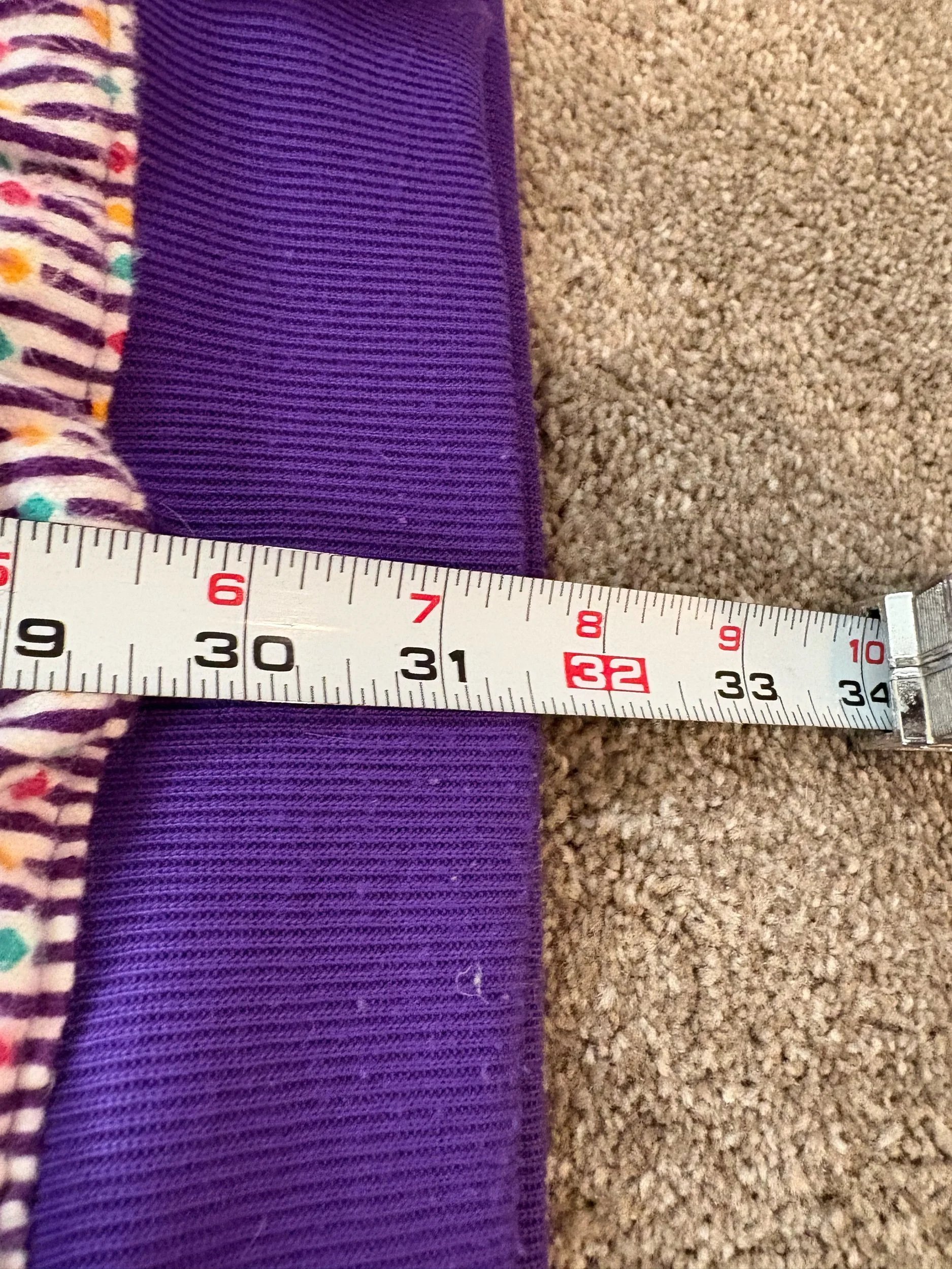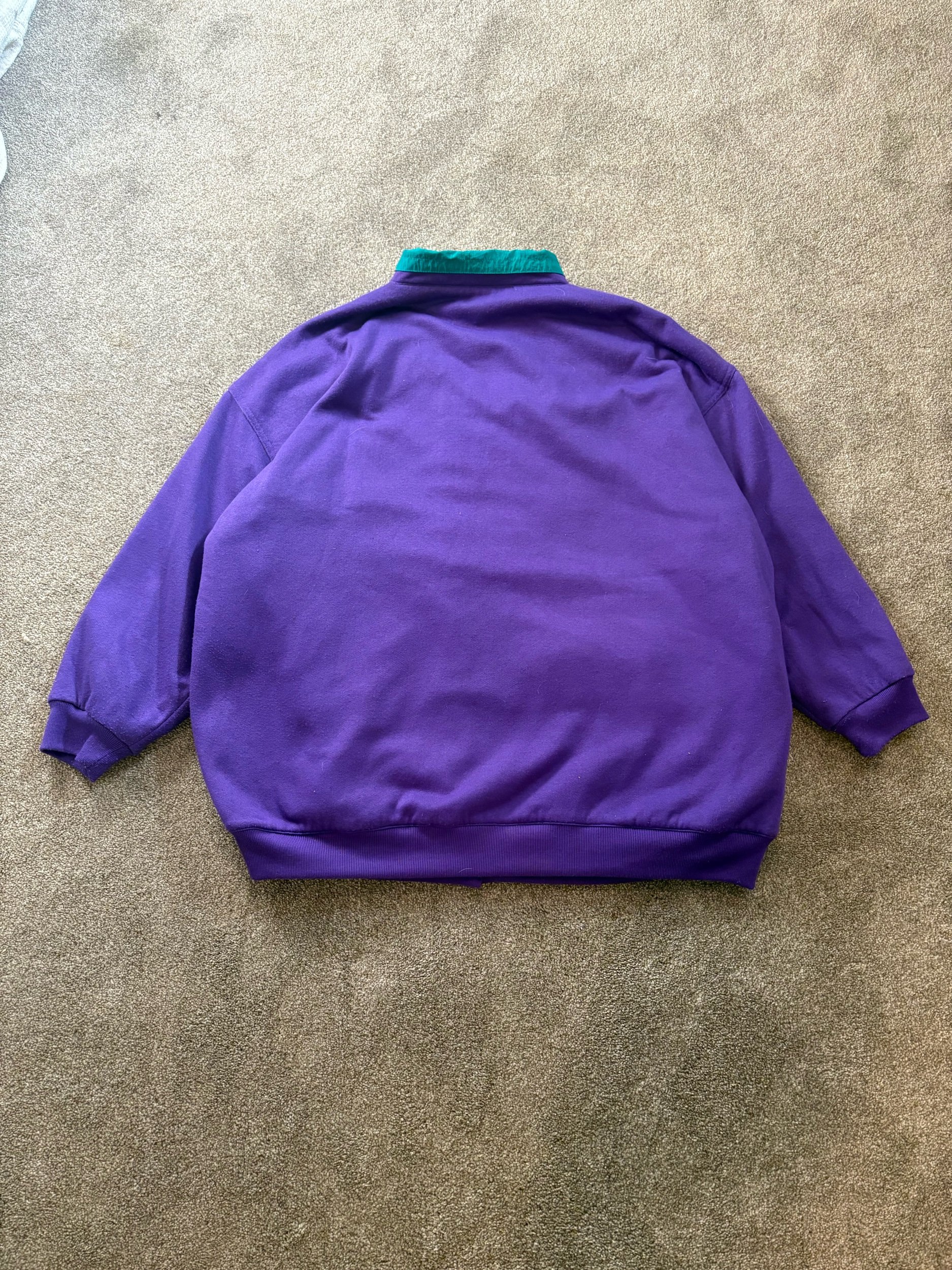 Purple on one side, White/Purple/Green pattern on the other side. Both sides with pockets. Super fun and unique